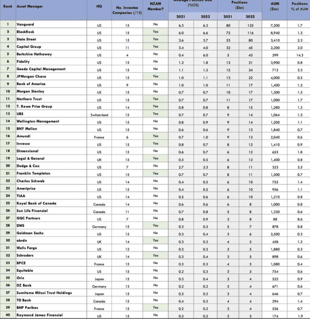 Top 40 Asset Managers by Value of Aggregated Oil & Gas Positions at end 2022