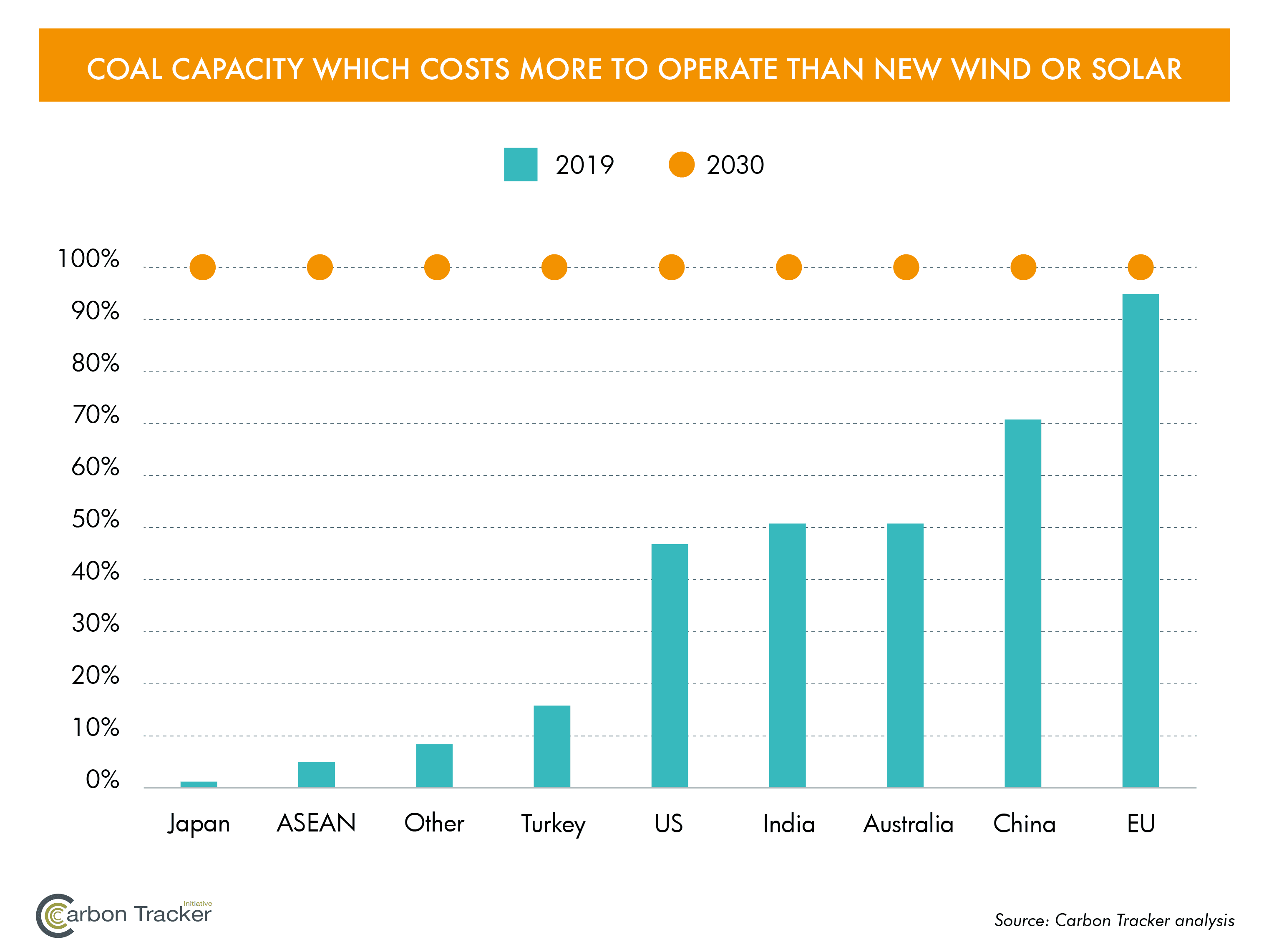 The report also finds that over 60% of global coal power plants are generating electricity at higher cost than it could be produced by building new renewables. By 2030 at the latest it will be cheaper to build new wind or solar capacity than continue operating coal in all markets.