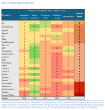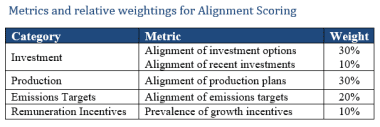 Investment Options, Recent Project Sanctions, Production Plans, Emission Targets, and Executive Remuneration. It also highlights how the degree of alignment can be used to assess the extent to which companies are exposed to an accelerating energy transition where oil and gas demand weakens.
