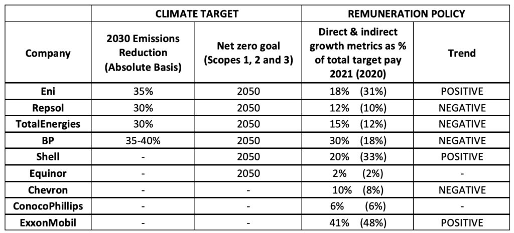 Companies with some of the most ambitious policies are among the worst offenders. BP has pledged to cut emissions from production and use of its products by 35-40% by 2030, yet 30% of executives’ total pay package is determined by remuneration targets that directly or indirectly incentivise production growth. Eni, TotalEnergies and Repsol have pledged cuts of 30-35% by 2030, but growth targets determine 18%, 15% and 12%, of management pay respectively.