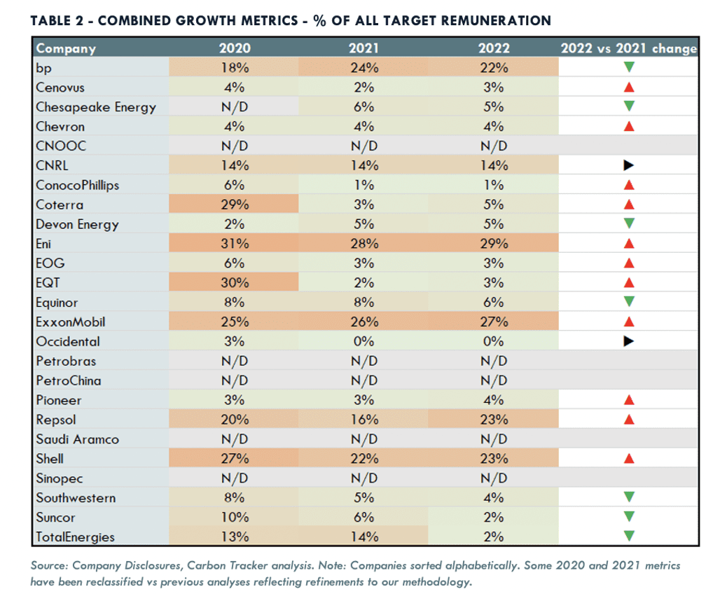For the purposes of this report, metrics are grouped into one of four categories, depending on whether they incentivise: i) growing production volume directly; ii) growing production indirectly; iii) actively incentivise a strategic response to the energy transition, or; iv) focusing on value or other non-growth metrics including for example safety performance.
