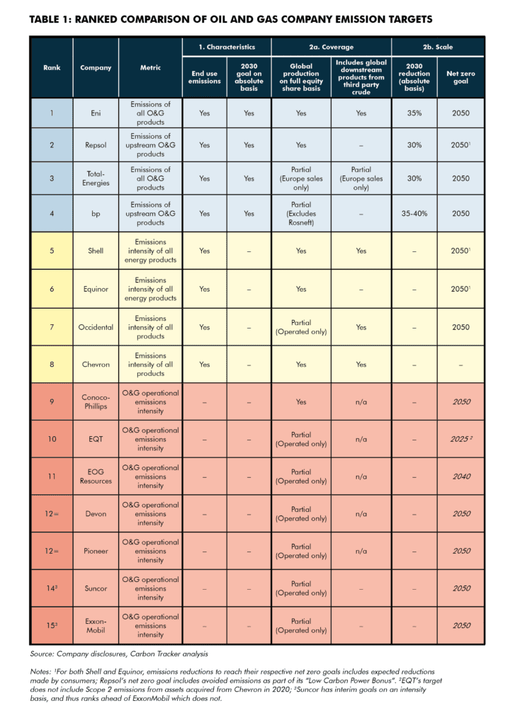 - We provide a relative ranking of the emission reduction targets of 15 of the largest listed oil and gas companies based on our “Hallmarks of Paris Compliance” (majors plus Equinor, Occidental, Repsol, Devon, EOG Resources, EQT, Suncor, and Pioneer).