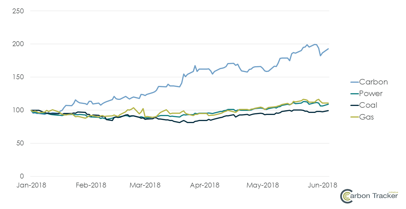 EU carbon, coal and German power in 2018 (January 2018 = 100)