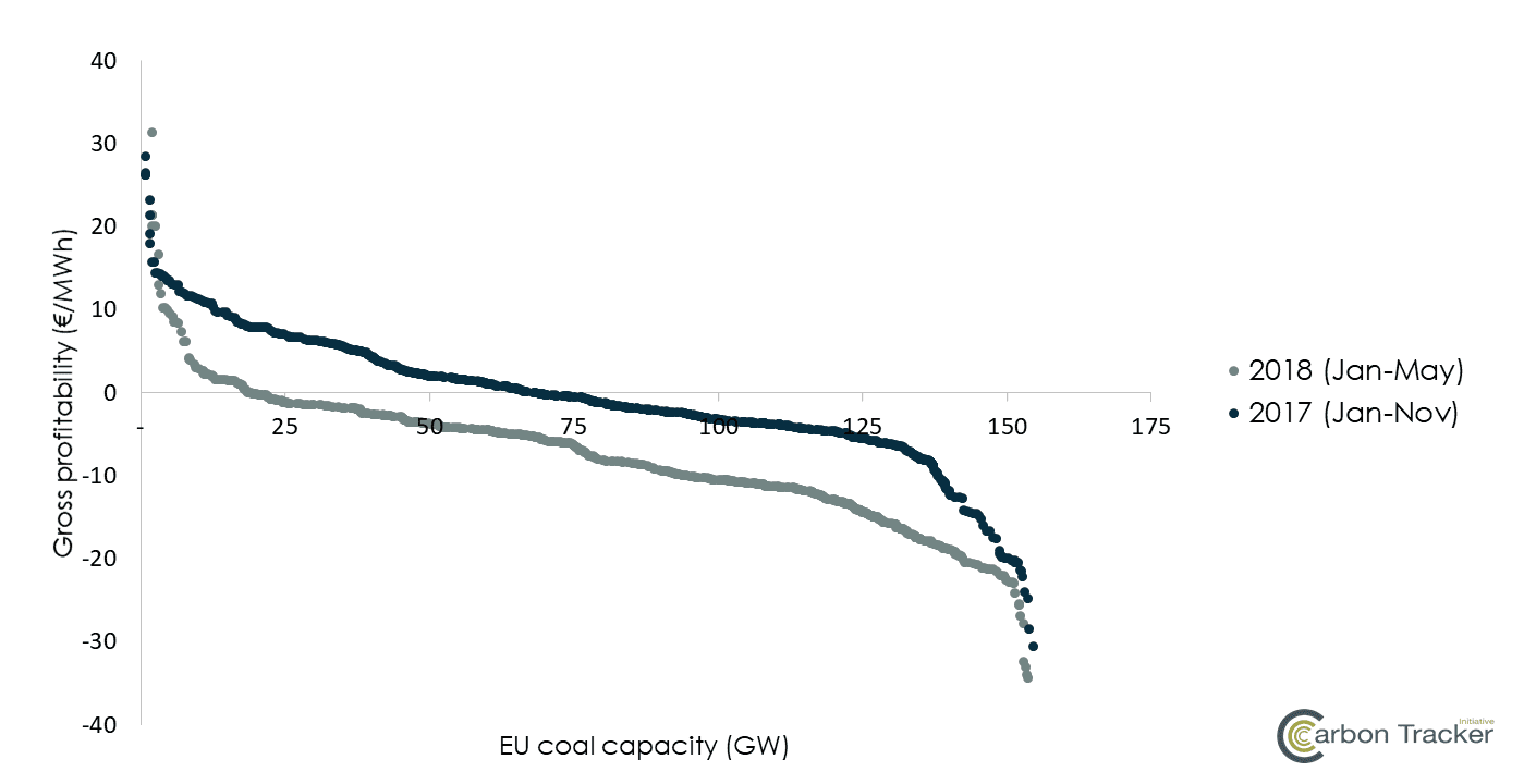 - Currently, around 75% of EU coal units are cash flow negative based on long-run marginal costs. While short-run marginal costs govern dispatch decisions and thus should promote coal over gas for the time being, long-run margins affect the bottom line and will continue to drive coal retirements, as most unit operators will still find it extremely difficult to cover fixed O&M costs. As of May 2018, around 75% of EU coal units are cash flow negative based on long-run marginal costs.