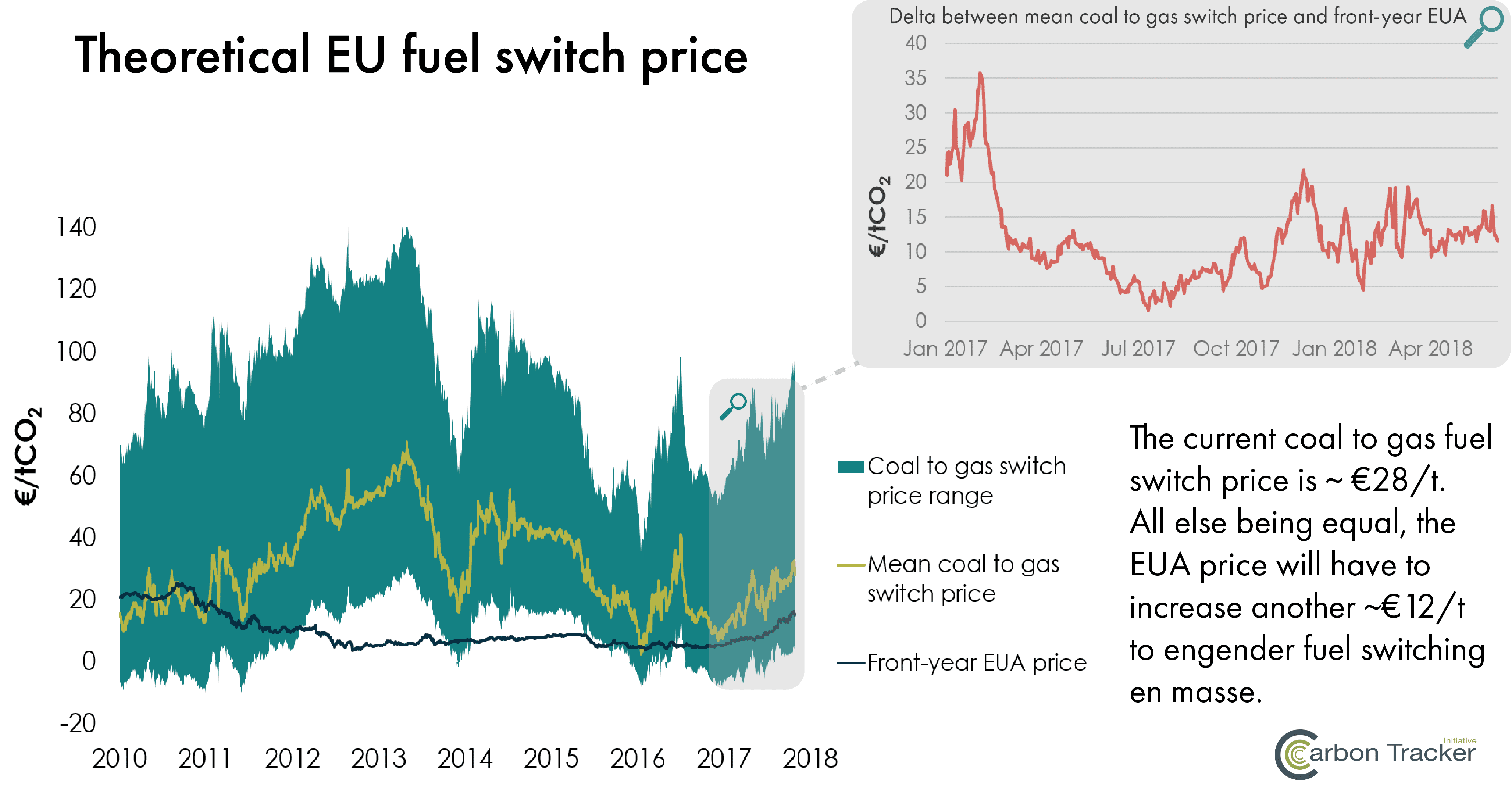 - All else being equal, EU carbon prices will need to increase another €12/t (to €28/t) to engender coal to gas switching en masse. From 2012 to 2015, the EU ETS did not generate prices high enough to promote coal to gas switching at scale. Despite EU carbon prices being at levels not seen in seven years, prices will need to increase another €12/t (to €28/t) for gas to run ahead of coal in the merit order. The extent of gas storage concerns will likely determine the potential for coal to gas switching in 2018. All else being equal, if gas prices decline to 2018 lows, the EU ETS would put gas in the money.