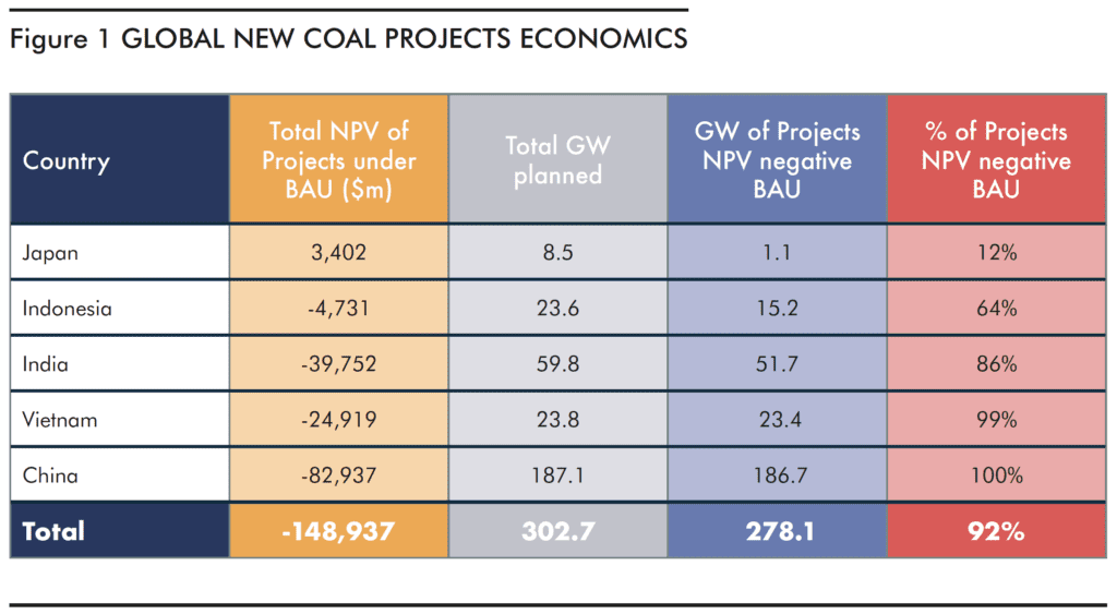 The report highlights that five Asian countries (China, India, Vietnam, Indonesia and Japan) are responsible for 80% of the world’s planned new coal plants and 75% of existing coal capacity. In these five countries, 92% of planned coal units will be uneconomic, even under business as usual, and up to $150 billion could be wasted.