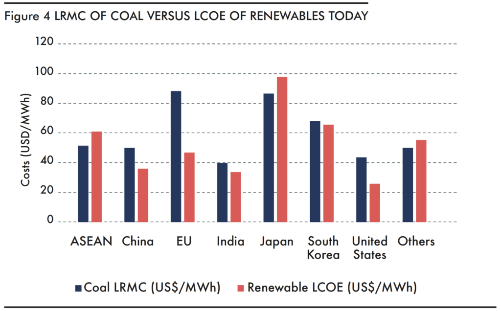 The analysis finds that investments in new renewables beat investments in new coal in all major markets when comparing the levelised cost of energy (LCOE) for both.