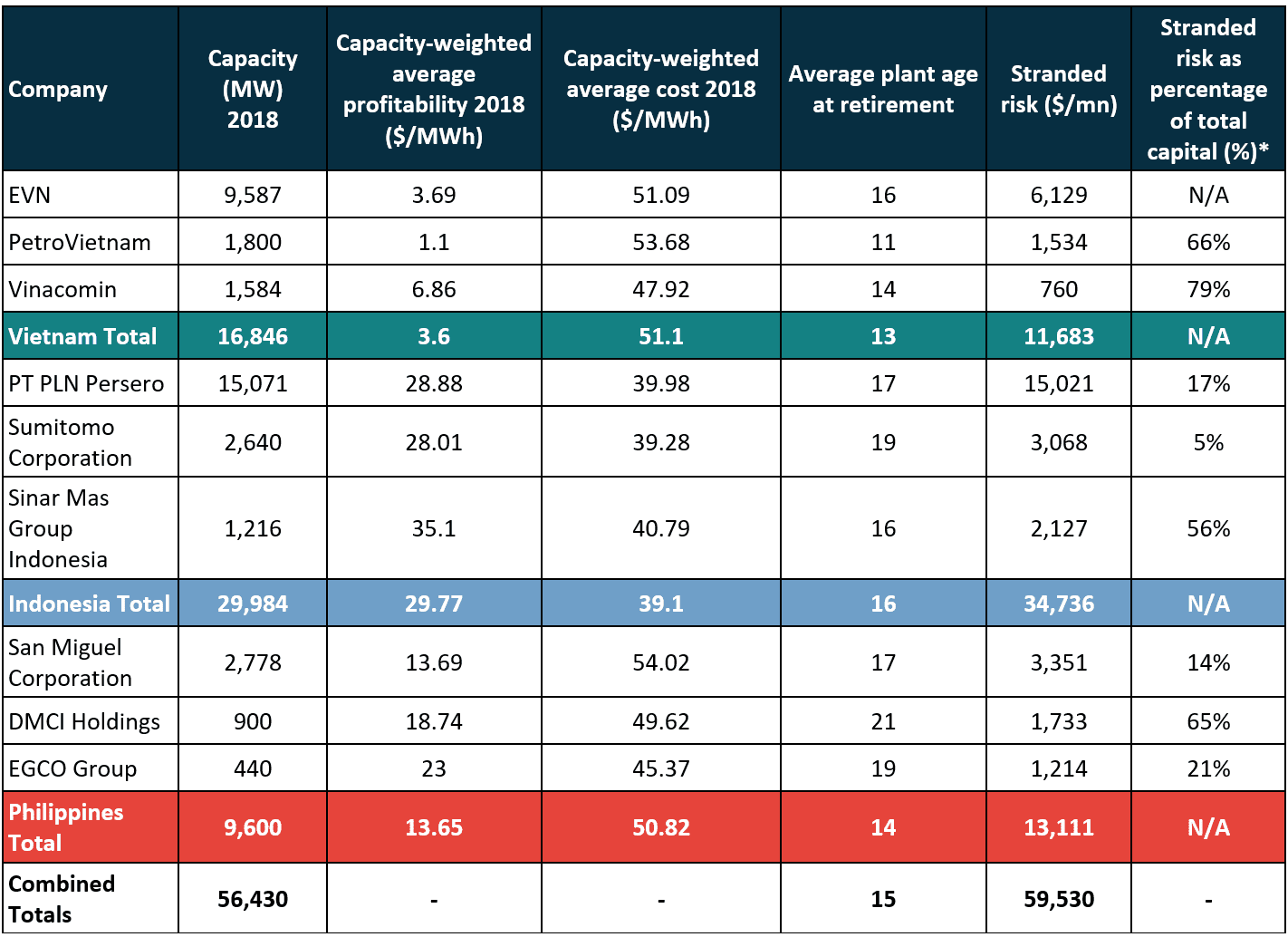 Coal power owners in Vietnam, Indonesia, and the Philippines collectively risk losing up to $60 bn in a scenario that sees coal power phased-out in a manner consistent with the temperature goal in the Paris Agreement. The average coal unit in these nations will be retired at just 15 years old, far earlier than forty-year assumptions often associated with coal plant lifetimes. Indonesia is the most at risk of stranded assets, with $35 bn at risk. Please see the individual country briefings for detailed company results.