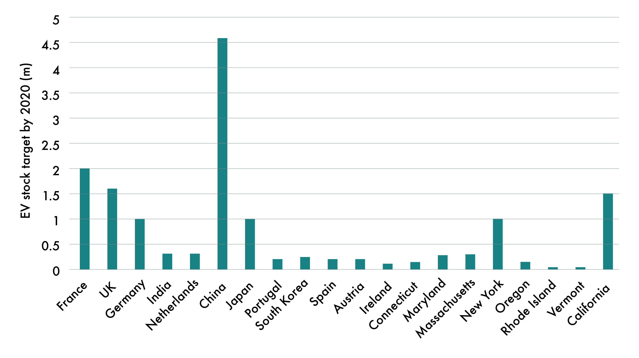 Cumulatively, these regions intend to see a stock of 15.2 million EVs by 2020. This is slightly more conservative than the expectations of the major OEMs. The US accounted for around a 10% of global light vehicle sales in 2016. Targets are only present in some states at present, however if the entire US market is included these countries add up to around 75% of sales in 2016.