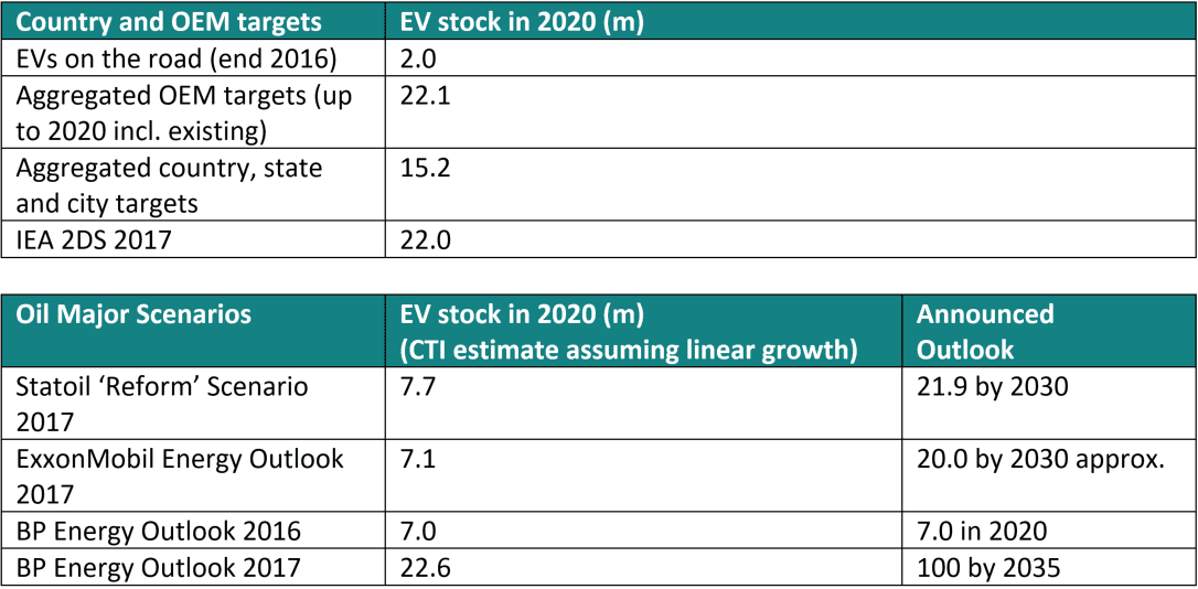 - Growth of electric vehicles (EVs) in scenarios developed by some oil majors is ten years behind the level expected by the largest car manufacturers (OEMs) in 2020.
