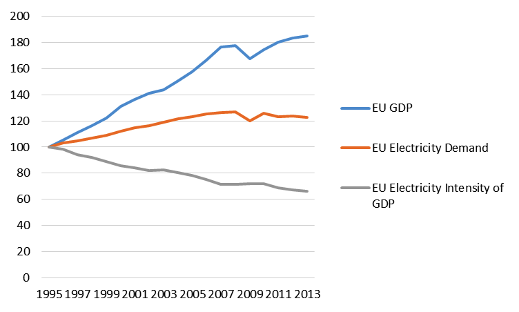 EU electricity demand fell 3.3% from 2008 to 2013, whilst GDP grew 1%. This improved efficiency of economies demonstrates that continued economic growth is not necessarily dependent on parallel growth in energy.Figure 2. EU electricity demand versus EU GDP and electricity intensity of GDP (1995 = 100)