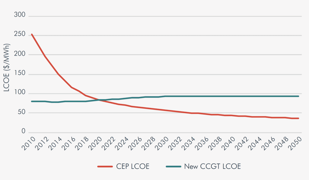In Foot of the Gas, we analyse the financial viability of new gas-fired power plants in the United Kingdom. We compare the cost of gas-fired power plants with those of a clean energy portfolio (CEP) providing the same grid services – monthly energy, peak capacity, and flexibility. These CEPs combine clean energy technologies, including onshore wind, offshore wind, utility-scale solar photovoltaics (PV), battery storage, energy efficiency, and demand response elements to provide the same grid services as gas-fired power plants. Foot off the Gas finds that a CEP is already more cost competitive than new combined-cycle gas turbines (CCGTs) and offers the same grid requirements as gas plants i.e., a CEP will “keep the lights on”. Consequently, we find that investment in new CCGTs would not only be bad for emission goals but also lead to comparatively higher electricity prices and would result in a £9 billion ($13 billion) stranded asset risk.Figure 1: CEP LCOE vs proposed CCGT gas plant LCOE
