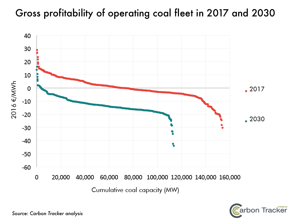 Confidence in coal-heavy utilities is returning as business restructurings, court rulings and power prices have revived balance sheets after years of huge impairments. For example, at the time of writing, RWE and Uniper have seen their share price increase by 64% and 79% respectively in 2017. However, we find that falling renewable energy costs, air pollution regulations and rising carbon prices will continue to undermine the economics of coal power in the EU, potentially making generation assets unusable by 2030. Specifically, this report finds:- 54% of coal is cashflow negative today increasing to 97% by 2030 – making units reliant on lobbying to secure capacity market payments (which the European Commission wants to prohibit by 2025) and avoid air pollution regulations.