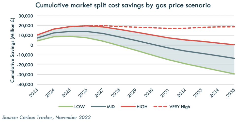 Market split design would however only result in cheaper bills for consumers over the longer-term if gas prices remain at high levels for the rest of the decade (fig 1), while pricing signals for flexible power sources such as battery storage would be weakened. Figure 1: Gas prices would need to remain high for market split design to achieve long-term cumulative cost savings