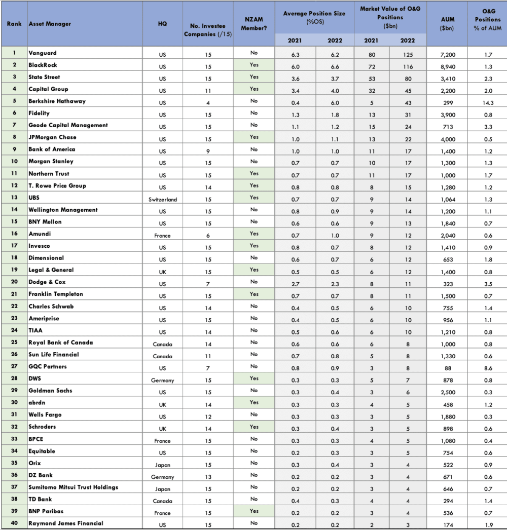 Top 40 Asset Managers by Value of Aggregated Oil & Gas Positions at end 2022