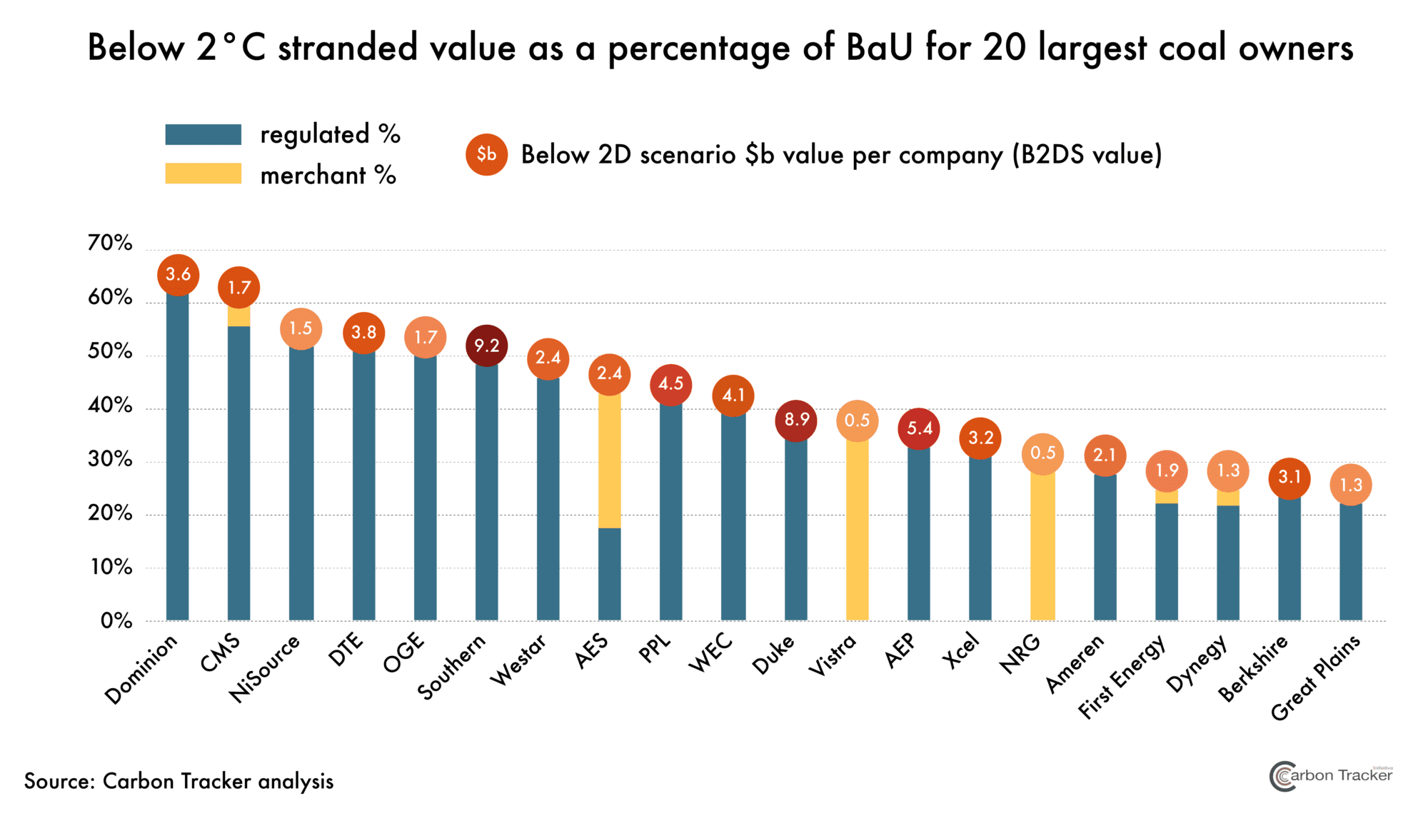 For example, Dominion’s units are both high cost and regulated. The materiality of stranded value is contingent on exposure relative to total assets. For instance, Berkshire Hathaway owns a substantial amount of regulated coal capacity, but the stranded value from these units is dwarfed by their market capitalisation resulting from its diversification across many sectors of the economy.