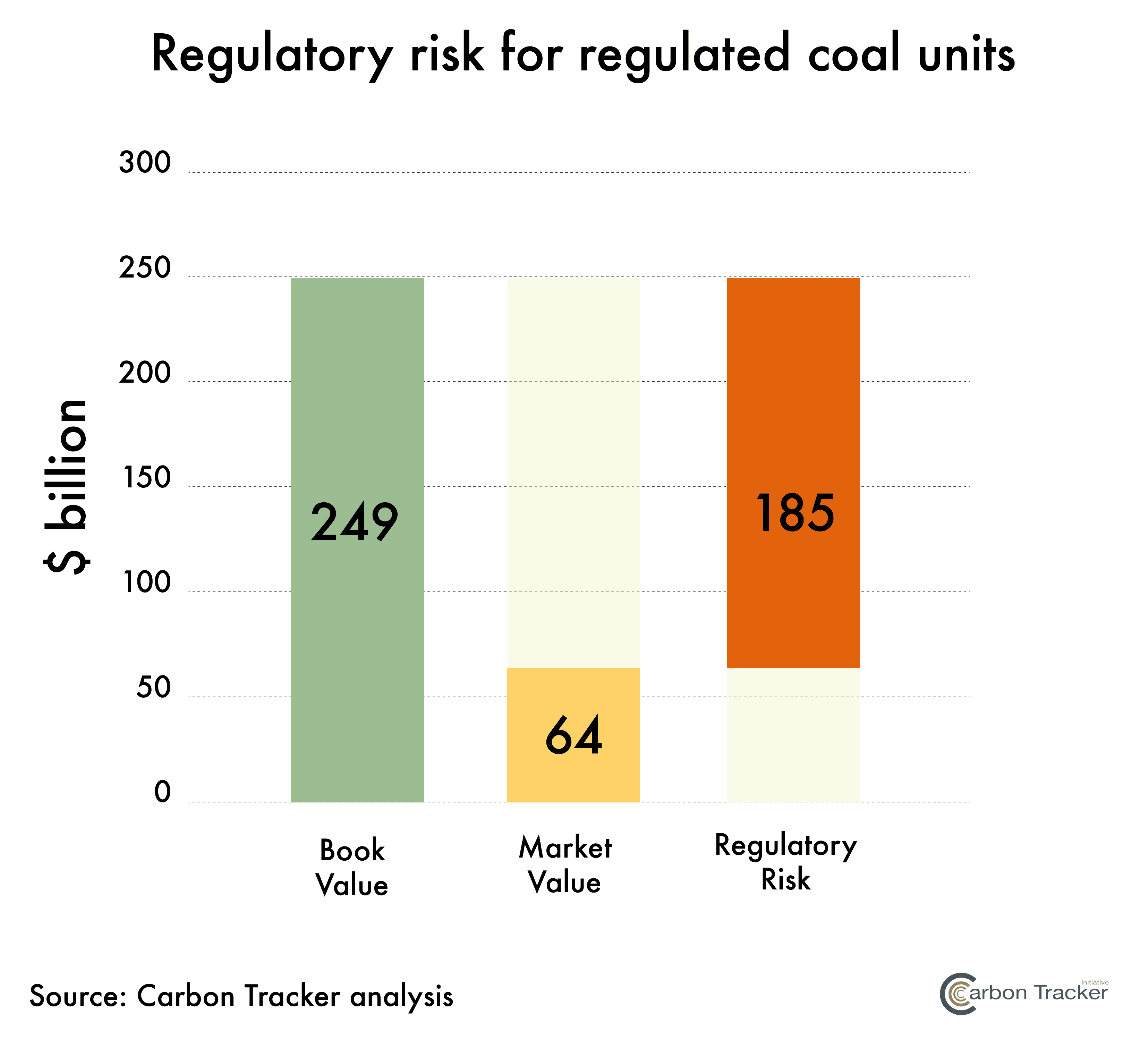 - Regulatory risk scenario for regulated units. Regulatory risk under this scenario is defined as the difference between regulatory and market valuation of all regulated units. Regulated units are valued based on the revenue requirement approved by regulators, while market valuation assumes the unit has no value if the operating cost is greater than the cost of a new CCGT. The impact on unit valuation from comparing assets with the most competitive dispatchable power technologies is aggregated to highlight the extent uncompetitive coal power is being subsidized by an out of date regulatory framework.