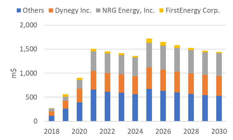 Our interpretation of the proposal is that it will effectively subsidise those loss-making coal and nuclear units operating in organised markets. According to our analysis, 48 GW or around 17% of total operating coal capacity would potentially be eligible under the NOPR. 90% of eligible units are based in PJM and MISO.[i] Of the 48 GW potentially eligible, 23 GW of coal could be loss-making from 2018-30. If these coal units continue to operate and recover loses it could cost the US energy consumer an additional $1.4b pa from 2018-30. This assumes the EIA’s high resource scenario (average gas and coal prices of $4.50/mmbtu and $2.20/mmbtu respectively) and the modelling methodology outlined in our recent report No Country for Old Coal Gen.Who gets the coal subsidy? NRG, Dynegy and FirstEnergy.