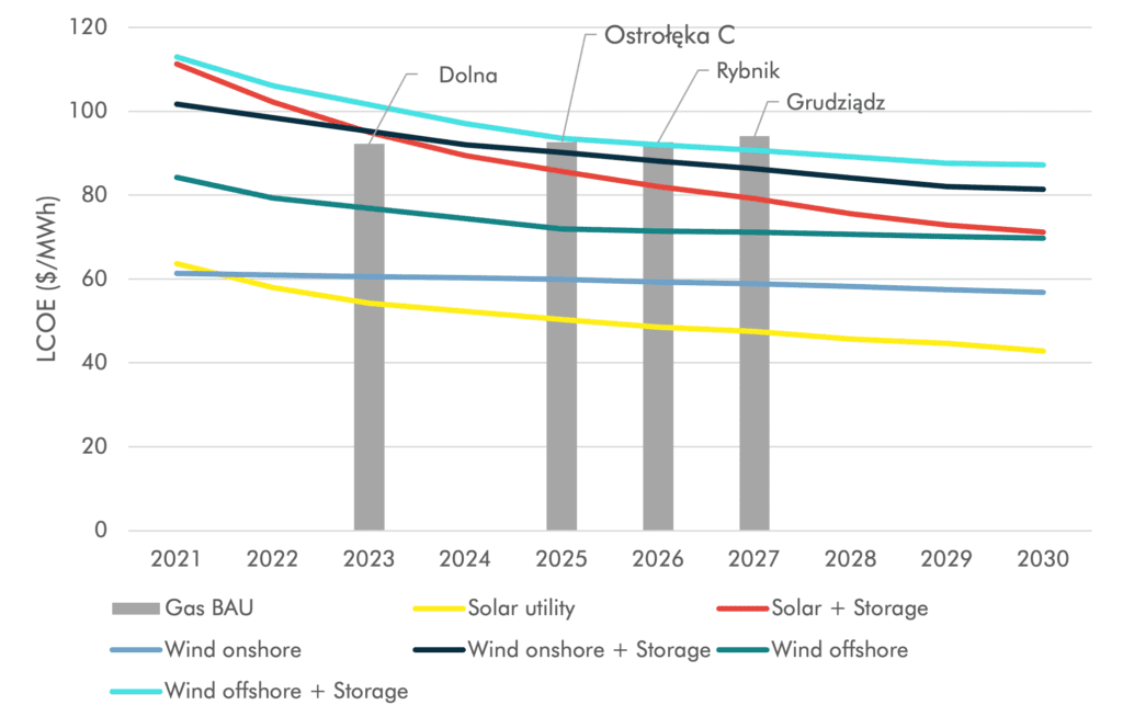 Senior analyst and report co-author Jonathan Sims said: “Costs of clean technology continue to fall and by mid-decade solar and wind farms backed by battery storage will be able to provide flexibility services comparable with a gas peaker plant at lower cost. Pursuing gas will cost taxpayers billions in subsidies and higher energy bills, undermine EU climate targets and expose the country to pressure from foreign gas suppliers.”