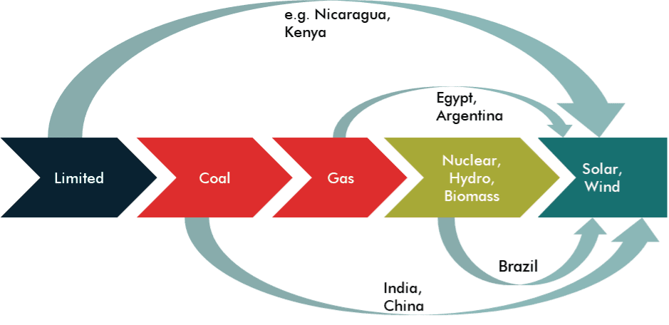 The story of the energy transition is more nuanced for emerging markets than for advanced economies — and offers more opportunity. Emerging markets have several energy transitions underway simultaneously. These include: a shift from traditional biomass to modern energy; a shift in patterns of energy demand thanks to rapid urbanisation and industrialisation; deeper integration into and influence in global energy markets; and the imperative of cleaning up the energy mix due to a shrinking carbon budget. These developments indicate that market size and technology developments could enable a double/triple leapfrog, namely increasing access to energy, rapid electrification of productive sectors of the economy, and a growing share of renewables in that electricity mix. This kind of transformation has not happened in the developed world, which has historically followed a more linear trajectory in energy transitions.How to speed up the emerging market leapfrog