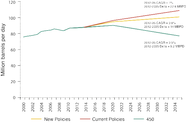 IHS and IPIECA argue that decline rates mean the world will continue to need new oil and gas projects. True, but if meaningful climate action is taken, it will need far less. The IEA 450ppm scenario sees 2035 oil demand 25% below the business as usual case. This means fewer new projects – and hence less capital investment.Figure 3: IEA oil demand projections – 2035 demand of 101 MBPD (New Policies Scenario) vs. 78 MBPD (450 Scenario)
