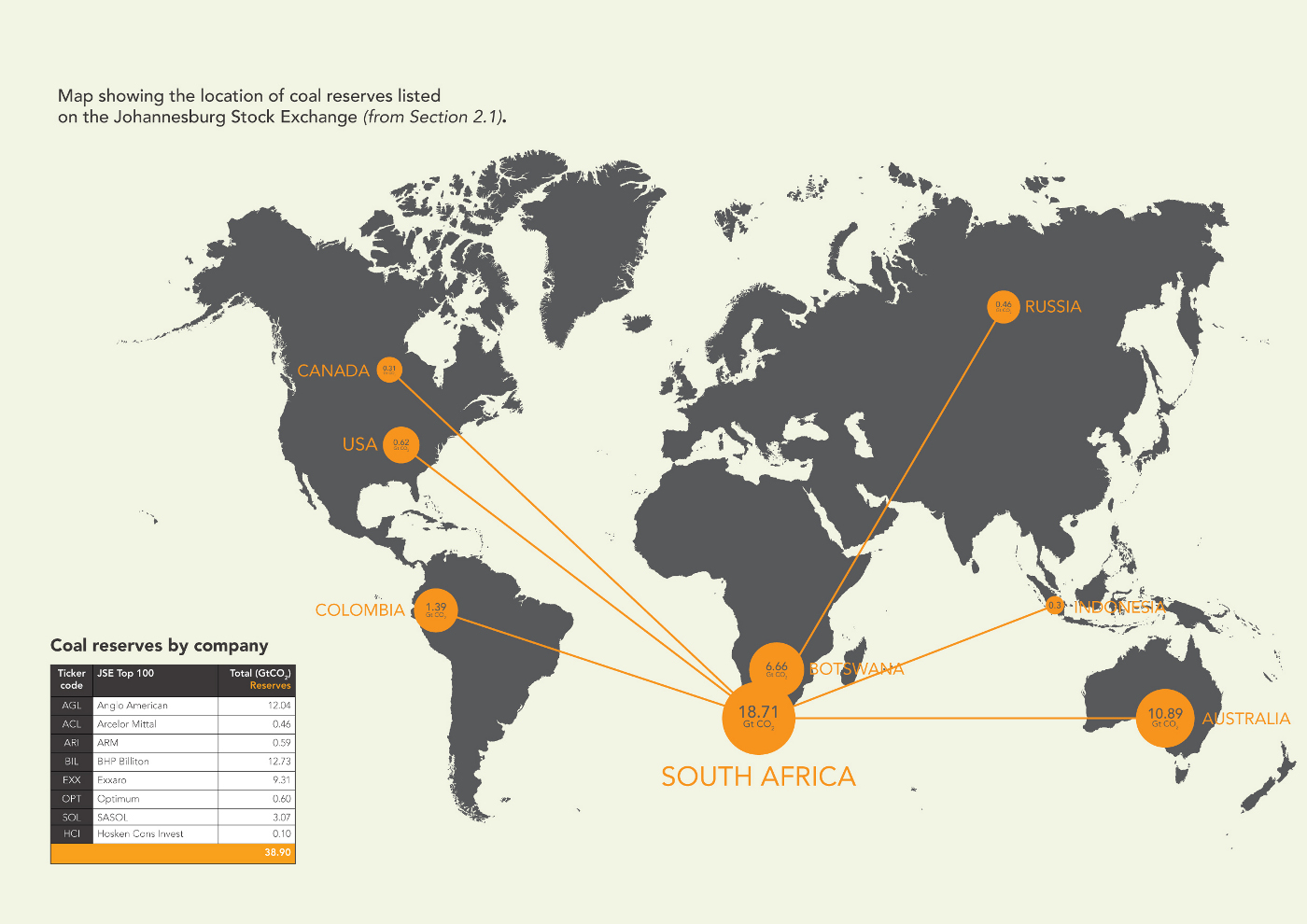 This analysis reveals that companies listed in South Africa have coal reserves equivalent to 38.9GtCO2e. As the map below illustrates, only around half of these reserves are located in South Africa. This demonstrates how a ‘South African Index’ is exposed to significant international risks. Similarly, South Africa exports around 30% of its coal. However, contracting Western markets and saturated Asian markets present an uncertain future for these coal exports.