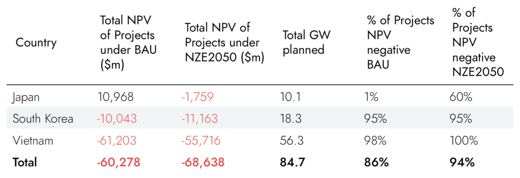 - New large-scale gas units in Japan, South Korea and Vietnam appear totally incompatible with a net zero emissions by 2050 pathway and any that are built may be forced to close well in advance of the end of planned lifetimes. Up to $70 billion could be lost if planned new gas units are developed under this more stringent climate scenario. The vast majority of projects would require extensive government backing to be made viable, the provision of which makes no sense when cheaper renewable alternatives are available.