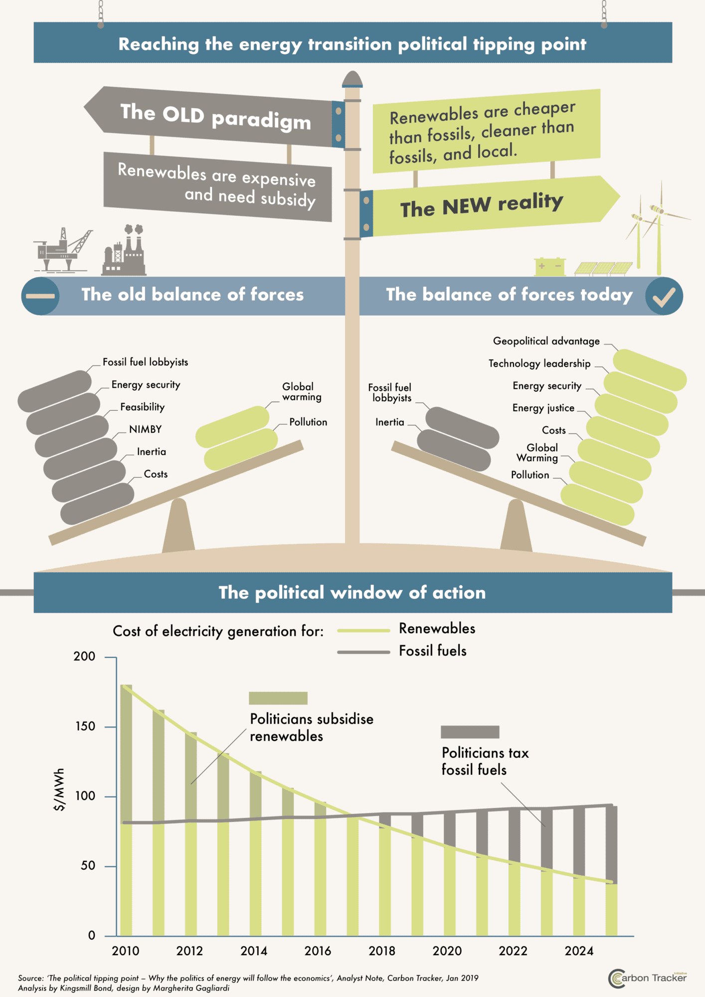 The political tipping point is coming. The falling costs of renewables are driving a political tipping point where politicians move from expensive support for renewables to embrace the sector and to tax fossil fuel externalities. This is a key driver of the Inevitable Policy Response showcased by the UN PRI.