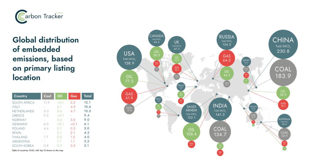 Unburnable Carbon: Ten Years On finds that the majority of embedded emissions are listed on the stock exchanges of China, USA, India, Russia and Saudi Arabia where, with the exception of the USA, emissions are dominated by the partial listings of state-owned companies.