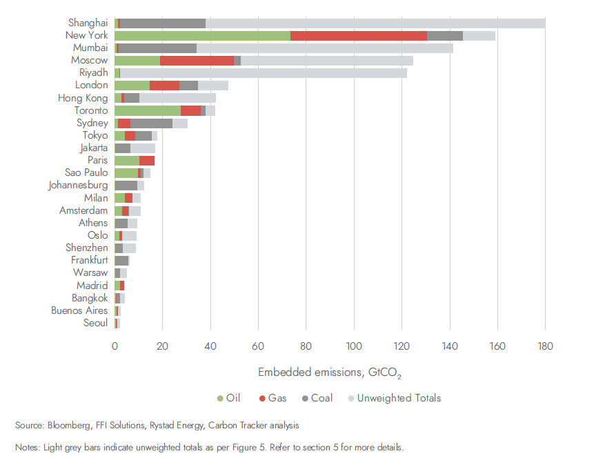 Figure 1: Emissions embedded (GtCO2) in the reserves of listed and partially-listed companies, by financial centre of primary listing, free-float weighted.