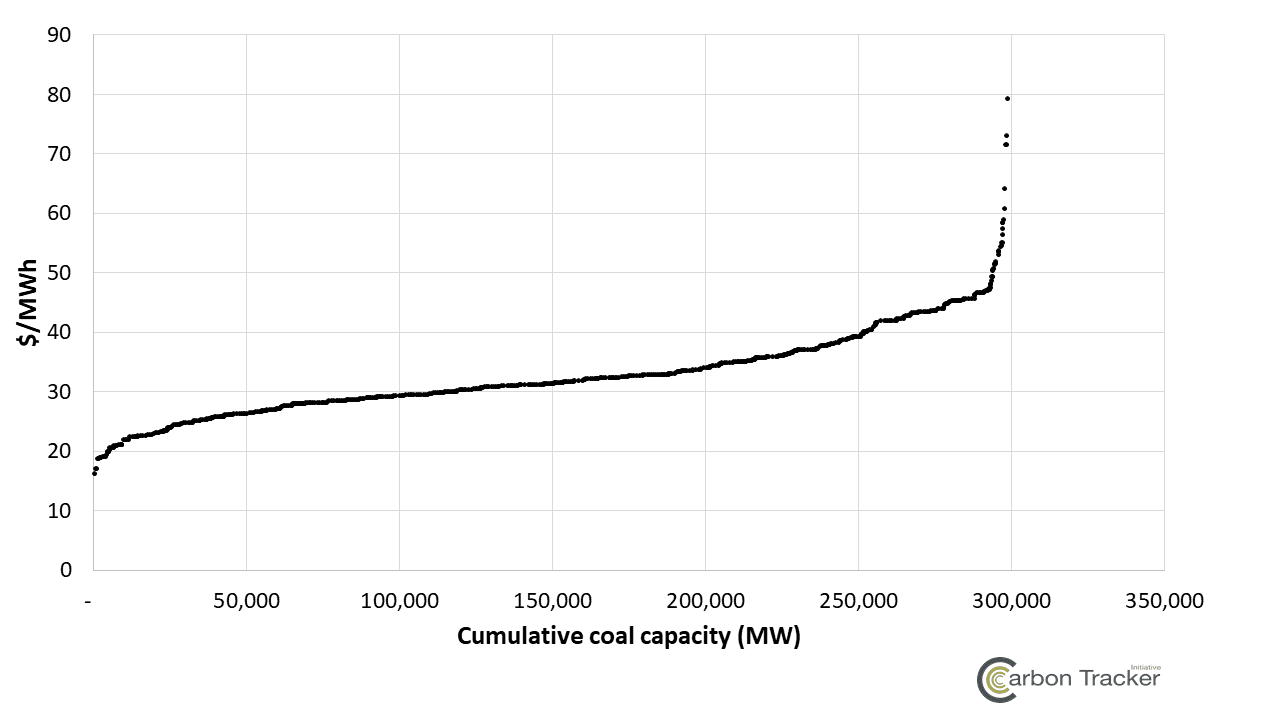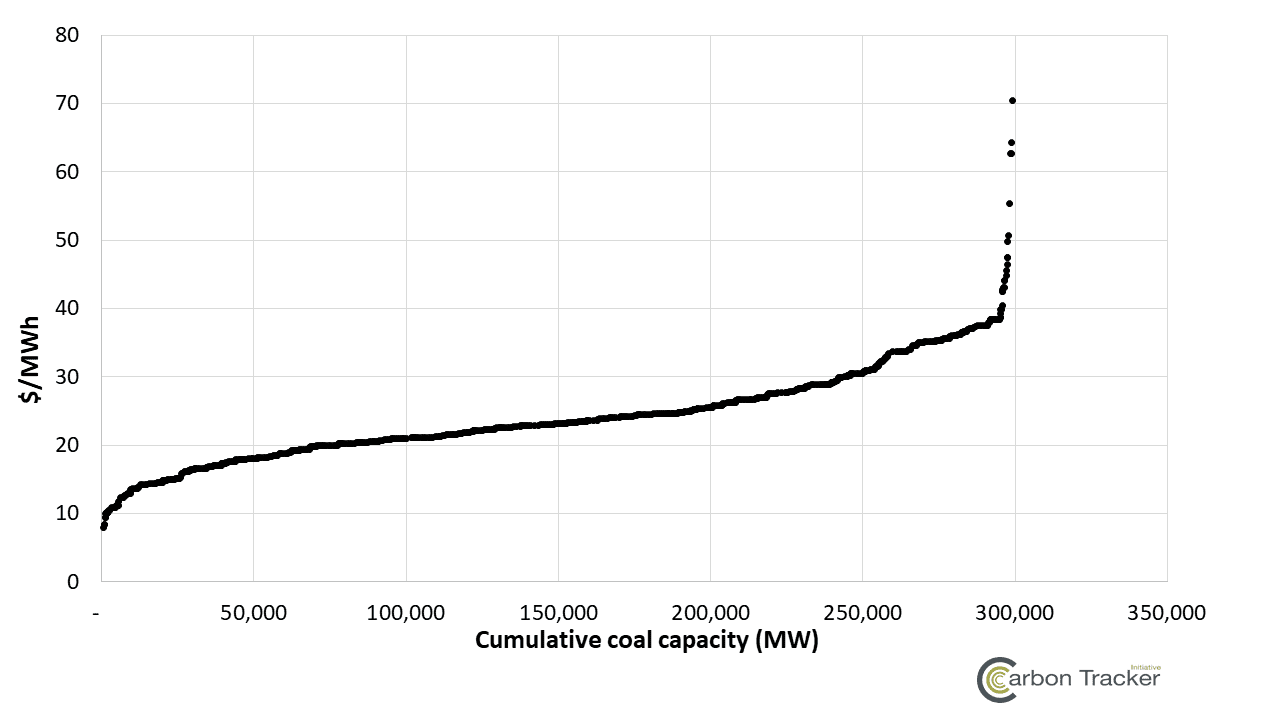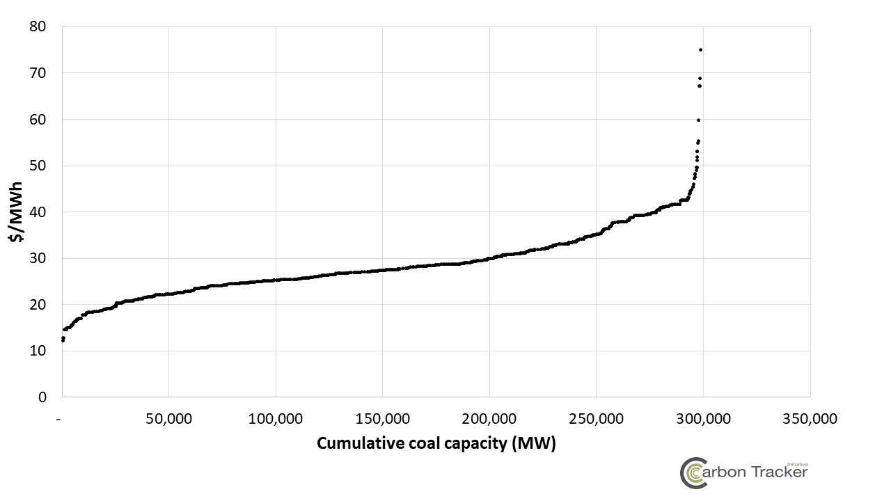 Power markets throughout the world are oversupplied due to out-of-market renewables and, in the US context, fierce competition from cheap natural gas. As detailed in our 2016 report, end of the load for coal and gas, this situation has driven the capacity factor of coal units down in all major markets, including the US, the EU, China and India. In the US, for example, the average capacity factor of coal units has decreased from 61% in 2014 to 53% in 2016.[ii] As detailed in Figure 5, the anticipated cost of operating coal units in the US increases significantly from the current operating costs in Figure 3.Figure 5. Anticipated operating costs of US coal units