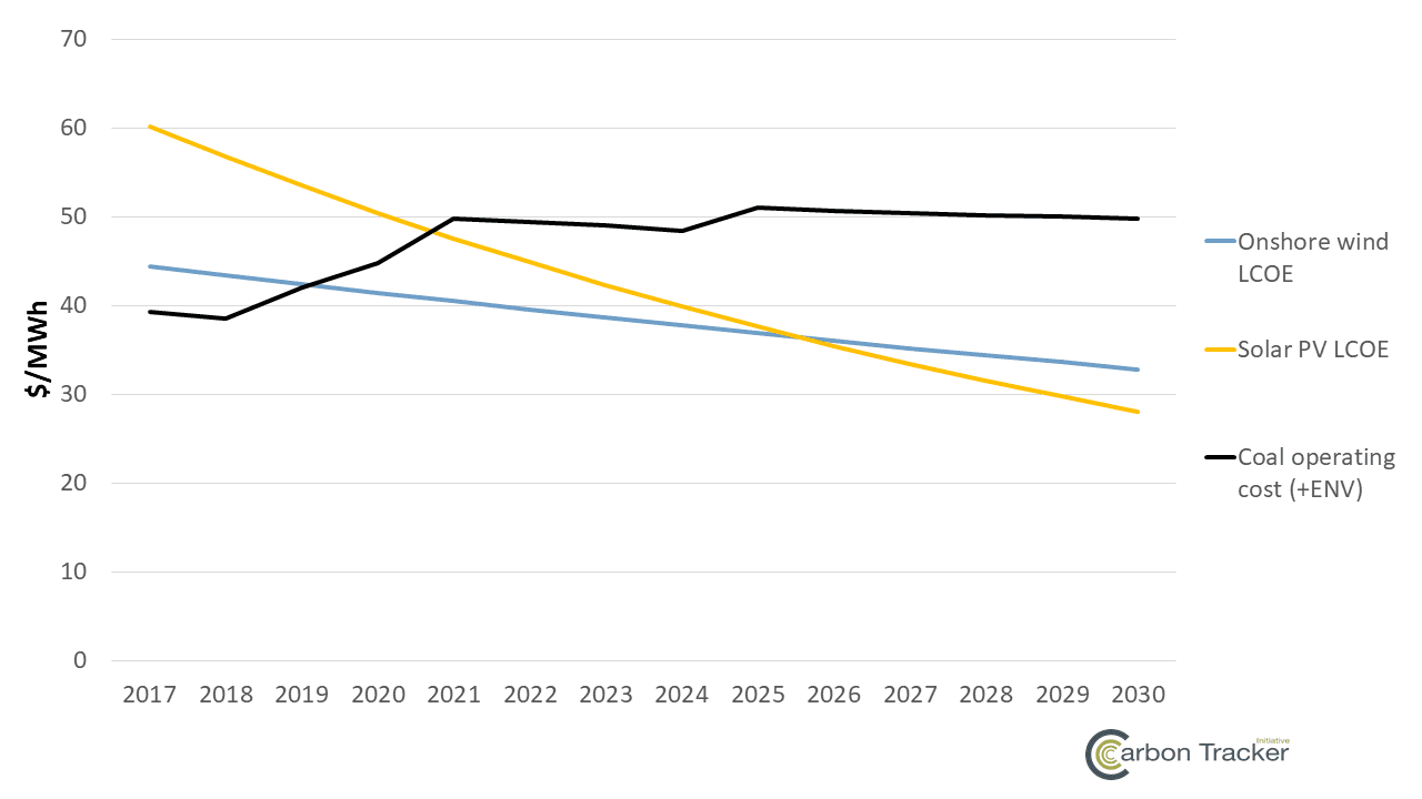- By the early 2020s it could be cheaper to build new renewables than operate US coal units. While the cost profile of coal increases due to investments to maintain performance and comply with environmental regulations, the levelised cost of renewables (LCOE) is expected to decline. In the context of the US, the operating cost of coal could be higher than building new onshore wind by 2020 and solar PV by 2021.